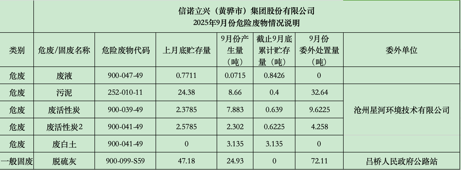 信诺立兴(黄骅市)集团股份有限公司 2025年9月份危险废物情况说明
